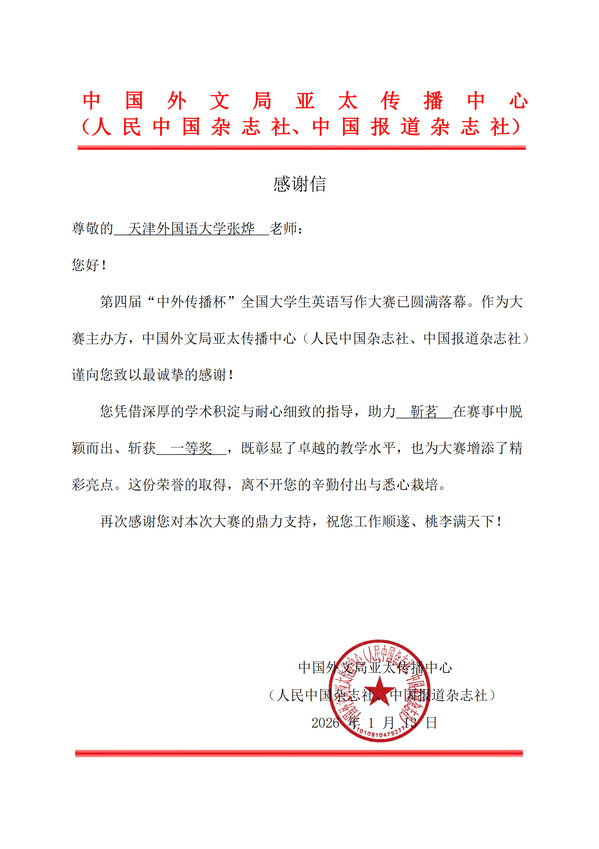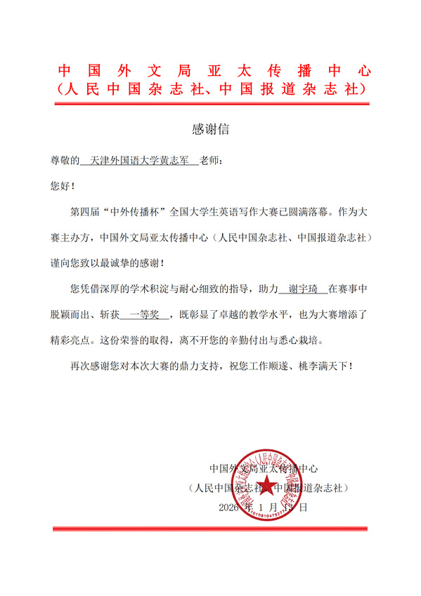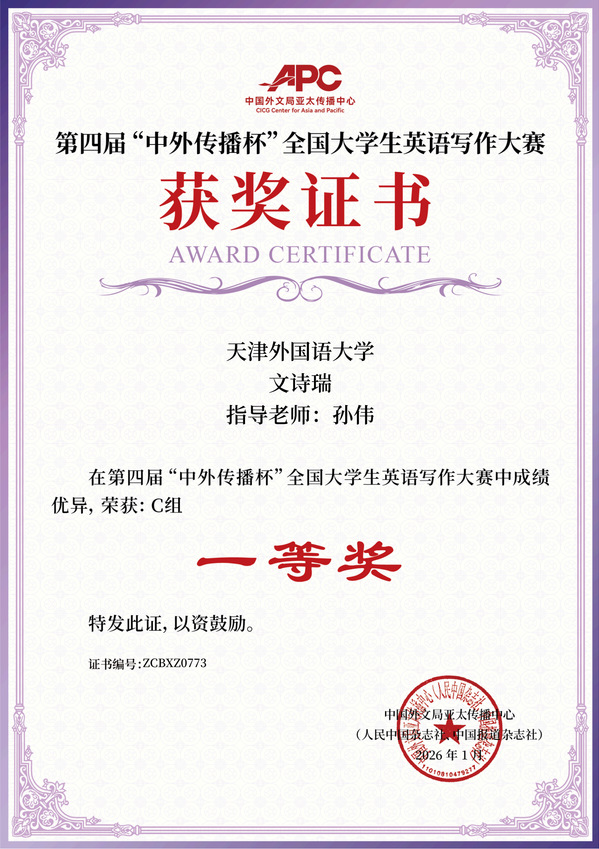 近日,第四届“中外传播杯”全国大学生英语写作大赛获奖名单正式揭晓,天外学子凭借扎实的语言功底与精湛的写作能力脱颖而出,在全国1700余所院校、6万余名参赛者的激烈角逐中斩获累累硕果,共有21人获一等奖、38人获二等奖、63人获三等奖、112人获优秀奖,获奖人数达234人,充分彰显了学校外语教学的扎实成效与人才培养的显著优势。