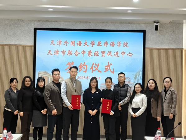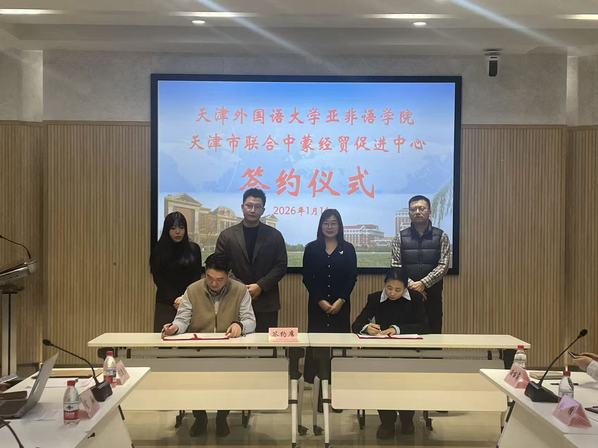 为深化产教融合、赋能中蒙经贸合作,1月14日,天外亚非语学院与天津市联合中蒙经贸促进中心(以下称贸促中心)在逸夫楼大江厅举行校企合作框架协议签约仪式。贸促中心理事长陈叡伯、秘书长李晨,亚非语学院相关负责人出席签约仪式。