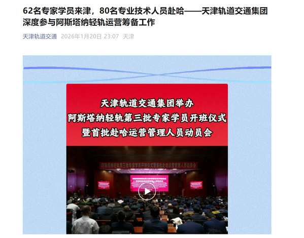 阿斯塔纳轻轨公司执行董事艾特霍金·包尔江·谢里克乌勒对天津轨道交通集团的大力支持表示感谢,他表示,集团所传授的知识与经验,对保障阿斯塔纳轻轨高水平运营、优质服务与技术可靠性至关重要。集团在运营管理、人才培养等方面,是值得信赖的顾问。期待未来双方合作持续深化,共创互利共赢的美好前景。