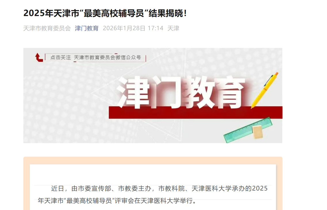 近日,由市委宣传部、市教委主办,市教科院、天津医科大学承办的2025年天津市“最美高校辅导员”评审会在天津医科大学举行。