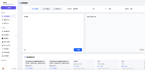 平台规划了四大核心模块:多语种智能翻译中枢、智能体创作广场、轻量知识图谱工具、数字人问答引擎。在“智能体广场”,师生可零代码构建特定场景的多语种助手——比如一个精通商务礼仪的虚拟接待员,或深谙文旅典故的智能导游。