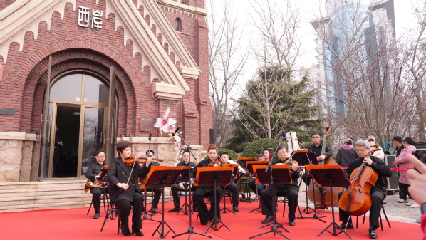 在西岸艺术馆主会场启动仪式暨文艺展演中,天外大学生艺术团与马达加斯加留学生宋莉同台献唱《大鱼》,歌声交融、情意绵长;经典民乐《茉莉花》婉转悠扬,为现场带来高品质视听享受。天津交响乐团奏响《春之声圆舞曲》,悠扬旋律唤醒街区艺术气息。中外学子以歌传情、以艺会友,尽显天外青年风采与国际化育人成果,赢得现场观众阵阵掌声。