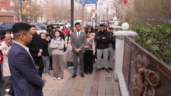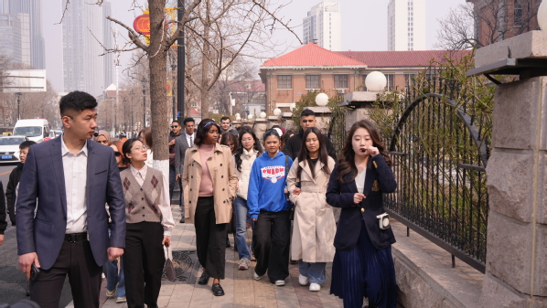 作为活动开篇亮点,“桃园漫步・集章打卡”路线在天外马场道校区钟楼前正式启动。学校精心组织30名各国留学生参与本次活动,埃及留学生丘山担任现场主持,结合城市历史文脉,细致讲解钟楼的建筑底蕴与文化内涵,带领市民与中外师生循着玉兰花香,沿途探访达文士楼、刘冠雄旧居、老武官胡同等特色点位,在历史建筑与春日盛景相映成趣中,沉浸式感受马场道沿线深厚的人文底蕴与城市“微更新”成果。