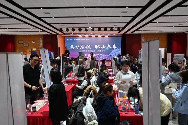 为扎实推进毕业生高质量充分就业,3月23日,英语学院在大学生活动中心成功举办2026年“英才起航・职击未来”英语专场春季双选会。校党委副书记胡志刚,副校长朱鹏霄,招生就业处、英语学院负责人深入招聘会现场,与用人单位和毕业生亲切交流,详细了解招聘需求和求职情况。各专业负责人及教师代表也主动走进企业展位对接沟通,精准推介毕业生,有效促进供需精准匹配。