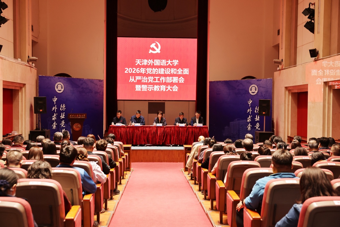 胡志刚传达了2026年教育系统全面从严治党工作视频会议以及天津教育系统全面从严治党工作会议精神。市纪委监委驻天津外国语大学纪检监察组组长李春瀛通报了违规违纪典型案例,提出了工作建议,并对2026年纪检监察重点工作进行了部署。副校长冯鹏传达了关于厉行节约习惯过紧日子相关要求。相关部门负责同志传达了上级有关会议精神,党委组织部、党委宣传部、党委统战部、党委学生工作部、马克思主义学院主要负责同志汇报了2026年重点工作安排。