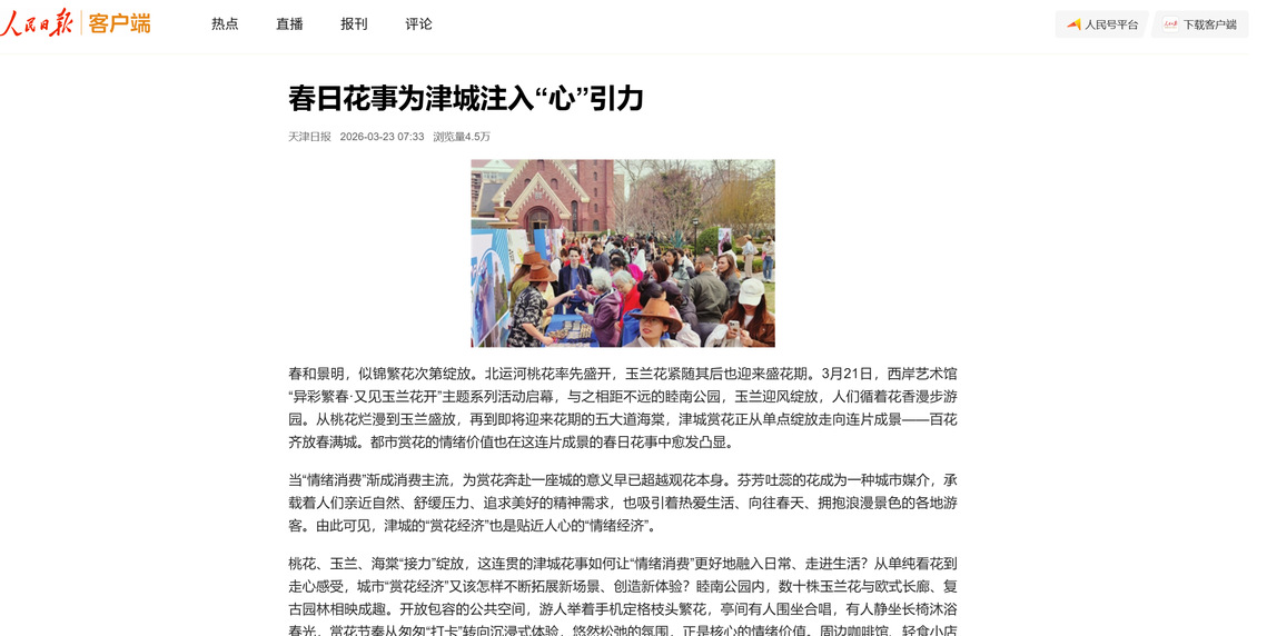 当“情绪消费”渐成消费主流,为赏花奔赴一座城的意义早已超越观花本身。芬芳吐蕊的花成为一种城市媒介,承载着人们亲近自然、舒缓压力、追求美好的精神需求,也吸引着热爱生活、向往春天、拥抱浪漫景色的各地游客。由此可见,津城的“赏花经济”也是贴近人心的“情绪经济”。