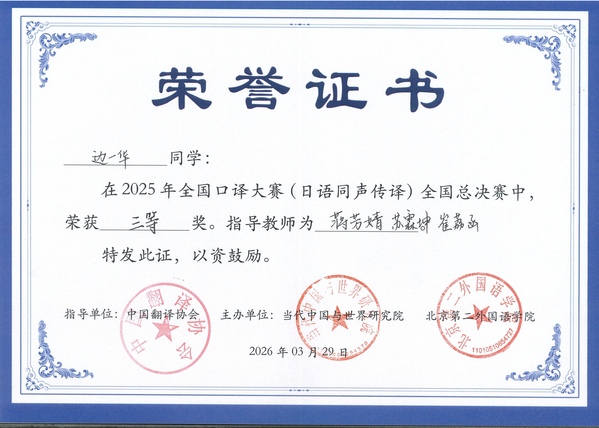 天外始终注重学生全面发展和综合能力提升,积极组织学生参与高水平翻译专业赛事,并选派专业教师开展全方位指导与培训,助力学生不断提升专业水平和实战能力。以此次大赛为契机,学校将进一步强化学生翻译实践与跨文化交流能力,持续提升专业人才培养质量,为推动中外文化交流互鉴贡献天外力量。