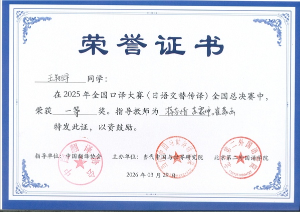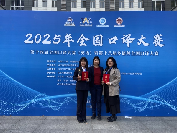 近日,由中国外文局、中国翻译协会指导,中国外文局当代中国与世界研究院和北京第二外国语学院联合主办的第十四届全国口译大赛(英语)暨第十八届多语种全国口译大赛在北京第二外国语学院落下帷幕。经过激烈角逐,天外2名学子凭借扎实的翻译功底与出色的临场表现取得优异成绩,3名教师荣获优秀指导教师称号。