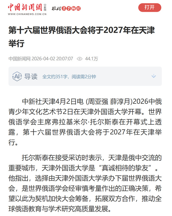 2026中俄青少年文化艺术节2日在天津外国语大学开幕。世界俄语学会主席弗拉基米尔·托尔斯泰在开幕式上透露,第十六届世界俄语大会将于2027年在天津举行。