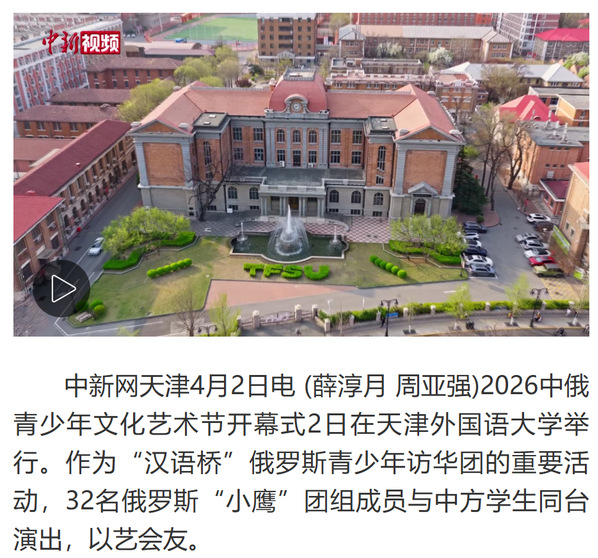 2026中俄青少年文化艺术节开幕式2日在天津外国语大学举行。作为“汉语桥”俄罗斯青少年访华团的重要活动,32名俄罗斯“小鹰”团组成员与中方学生同台演出,以艺会友。
