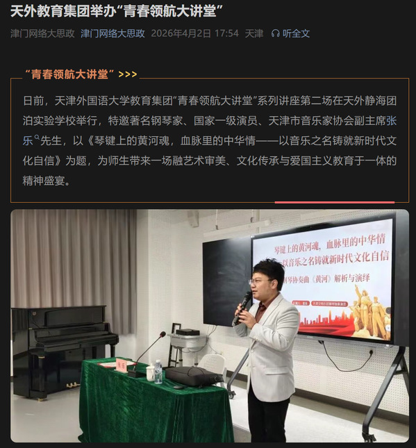日前,天津外国语大学教育集团“青春领航大讲堂”系列讲座第二场在天外静海团泊实验学校举行,特邀著名钢琴家、国家一级演员、天津市音乐家协会副主席张乐先生,以《琴键上的黄河魂,血脉里的中华情——以音乐之名铸就新时代文化自信》为题,为师生带来一场融艺术审美、文化传承与爱国主义教育于一体的精神盛宴。讲座中,张乐以深厚的艺术修养与澎湃的家国情怀,沿着《黄河》钢琴协奏曲的文化脉络层层展开分享。他从“为何是《黄河》”切入,深刻阐释这部作品作为中华民族精神史诗的血脉传承意义;细致梳理了从《黄河大合唱》到钢琴协奏曲的创作演变,解析交响乐团编制与乐器呈现,带领在场师生感受经典的艺术转化;并围绕协奏曲四个乐章逐一拆解,生动演绎黄河奔涌的精神交响,让在场师生直观感受音乐中蕴藏的民族力量。他谈到,每一个音符都是文化的血脉,每一次演奏都是对中华文明的致敬与传承,激励青年学子在艺术熏陶中坚定文化自信,增强民族自豪感。