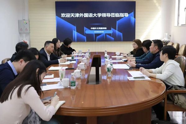 近日,天津外国语大学党委书记、校长李迎迎带队赴中国外文局翻译院调研。中国外文局翻译院院长黄玉龙会见天外一行。翻译院副院长王飞、朱颖,天外副校长冯鹏,双方相关部门负责同志参加会见。