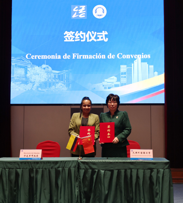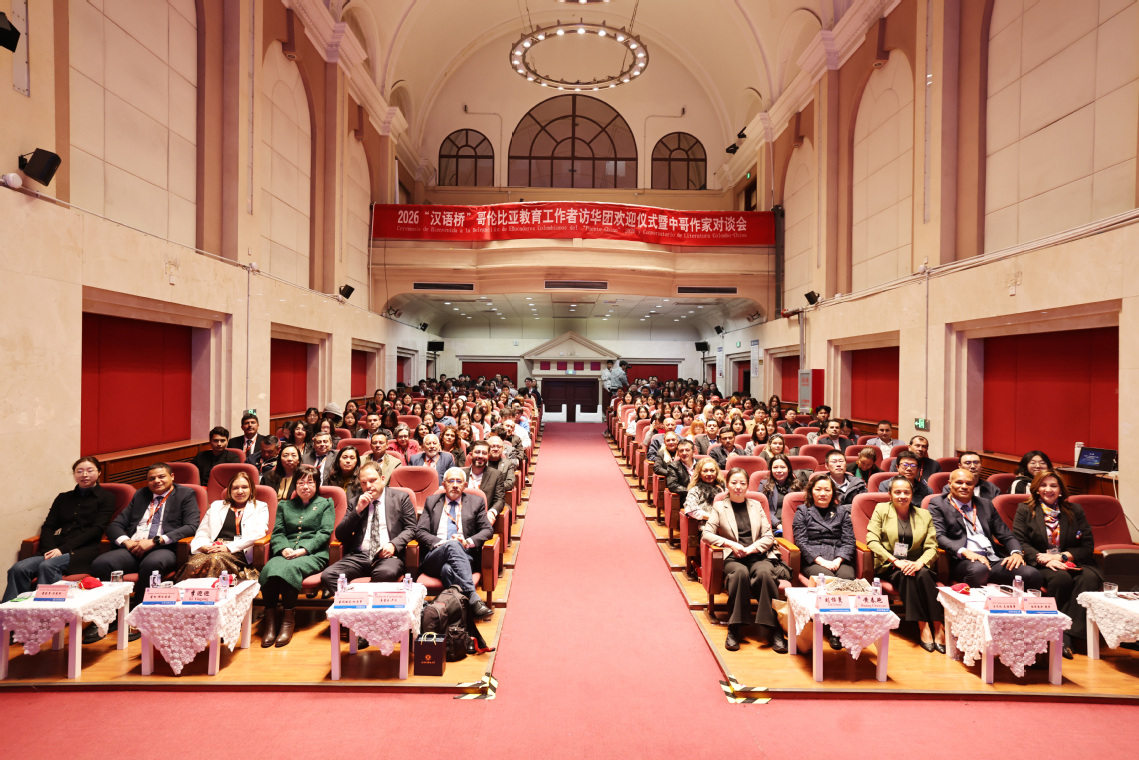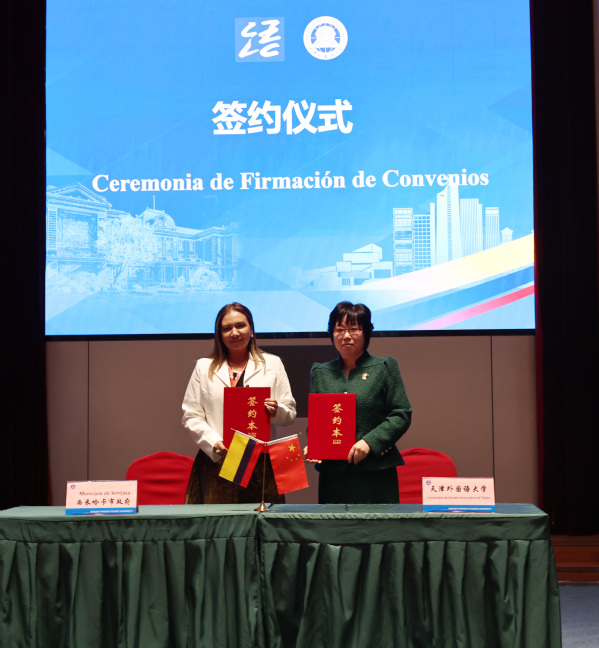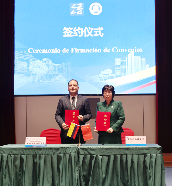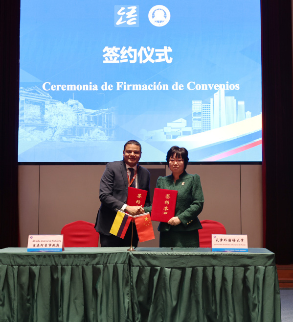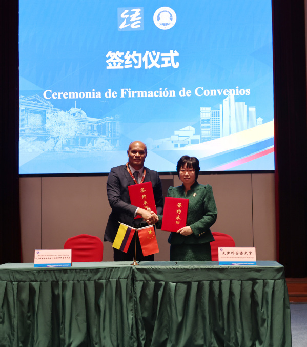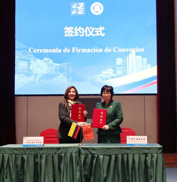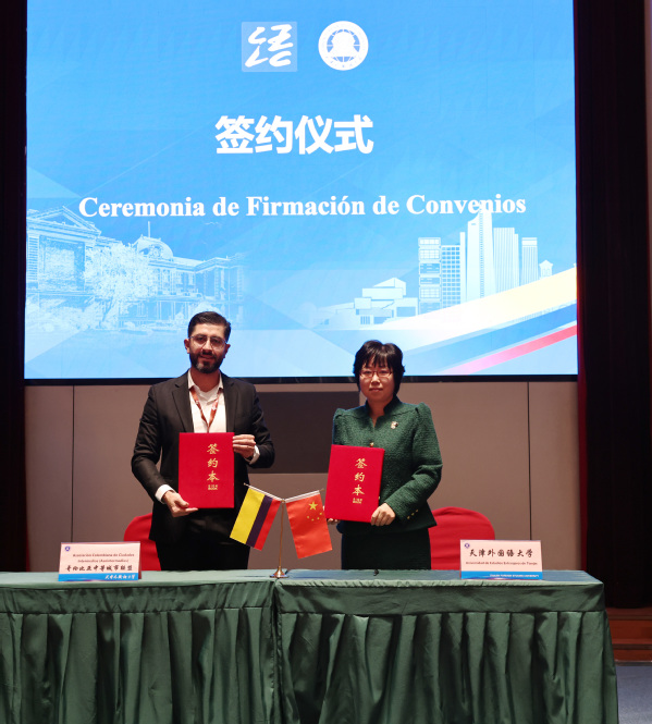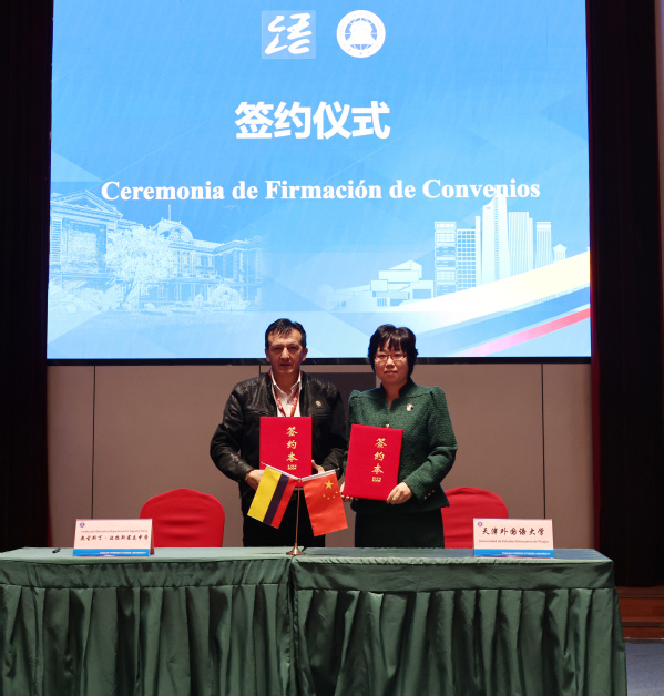 4月9日,由教育部中外语言交流合作中心主办,天津外国语大学承办的“汉语桥”哥伦比亚教育工作者访华团欢迎仪式在天外钟楼报告厅举行。哥伦比亚总统顾问维克多・德・库雷亚-卢戈,哥伦比亚省会城市联盟主席安德烈斯·圣玛丽亚·加里多,天津市委教育工委副书记刘怡蔓,天津市人民政府外事办公室党组成员、天津市对外友协副会长黄春艳,天津外国语大学党委书记、校长李迎迎出席仪式并致辞。访华团37名团员和天外师生共同参加了欢迎仪式。