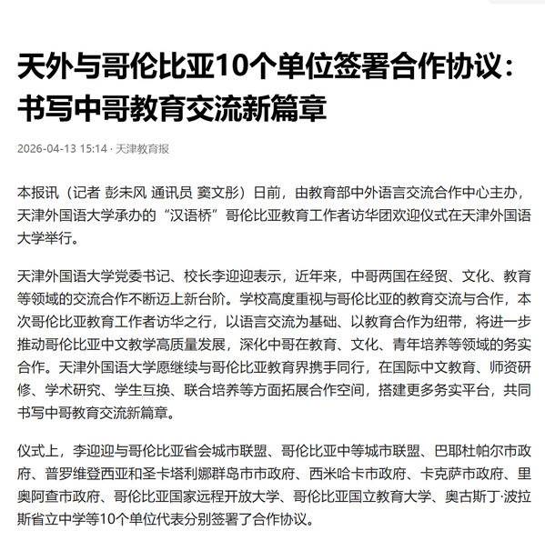 天津外国语大学党委书记、校长李迎迎表示,近年来,中哥两国在经贸、文化、教育等领域的交流合作不断迈上新台阶。学校高度重视与哥伦比亚的教育交流与合作,本次哥伦比亚教育工作者访华之行,以语言交流为基础、以教育合作为纽带,将进一步推动哥伦比亚中文教学高质量发展,深化中哥在教育、文化、青年培养等领域的务实合作。天津外国语大学愿继续与哥伦比亚教育界携手同行,在国际中文教育、师资研修、学术研究、学生互换、联合培养等方面拓展合作空间,搭建更多务实平台,共同书写中哥教育交流新篇章。