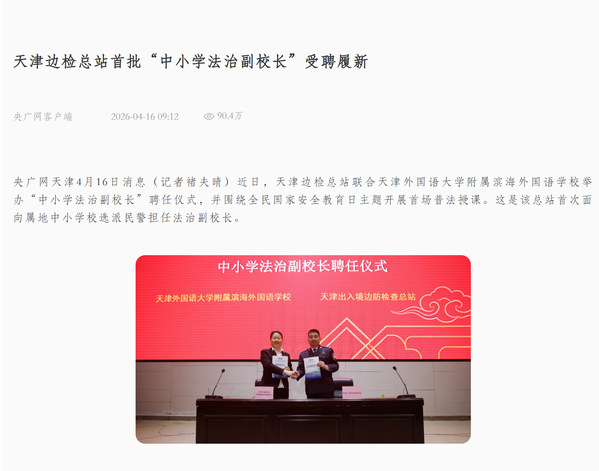 央广网天津4月16日消息(记者褚夫晴)近日,天津边检总站联合天津外国语大学附属滨海外国语学校举办“中小学法治副校长”聘任仪式,并围绕全民国家安全教育日主题开展首场普法授课。这是该总站首次面向属地中小学校选派民警担任法治副校长。