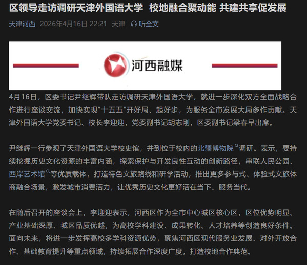4月16日,区委书记尹继辉带队走访调研天津外国语大学,就进一步深化双方全面战略合作进行座谈交流,加快实现“十五五”开好局、起好步,为服务全市发展大局多作贡献。天津外国语大学党委书记、校长李迎迎,党委副书记胡志刚,区委副书记梁春早出席。