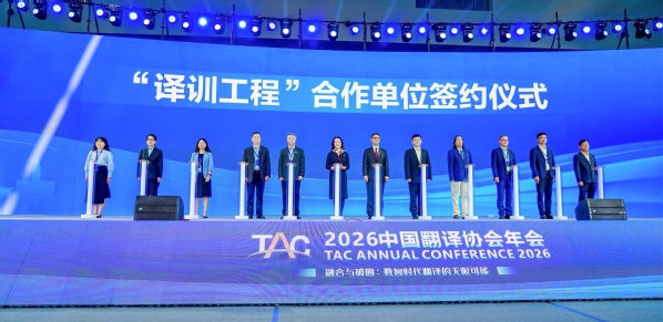 “译训工程”依托合作单位开展多类翻译培训,近三年已有超2100名学员参训。2026年,“译训工程”进一步拓展覆盖范围、丰富培训内涵、提升服务效能,持续汇聚行业优质力量,完善翻译培训体系,为行业发展筑牢高层次应用型翻译人才根基。开幕式上举行了“译训工程”第二批合作单位签约仪式。朱鹏霄代表学校上台签约。未来,天外将深度参与翻译人才培养体系共建,聚焦数智时代行业需求,完善“翻译+技术”复合型人才培养模式,为行业输送更多高层次应用型翻译人才。
