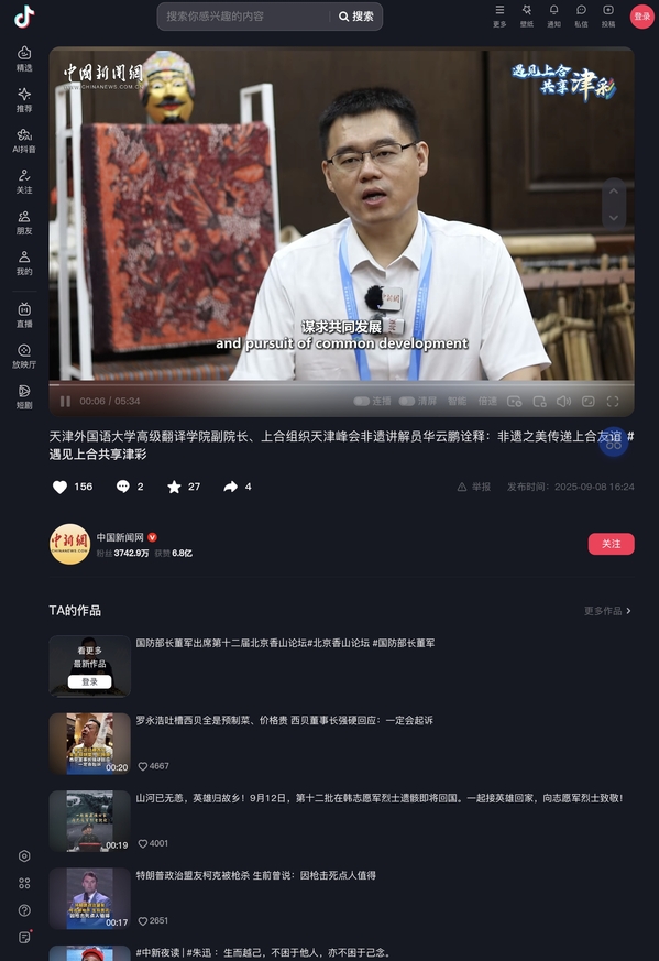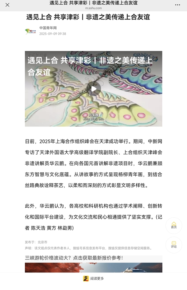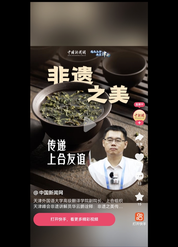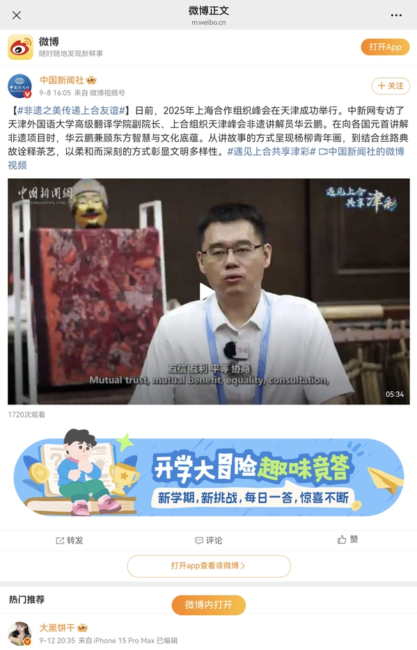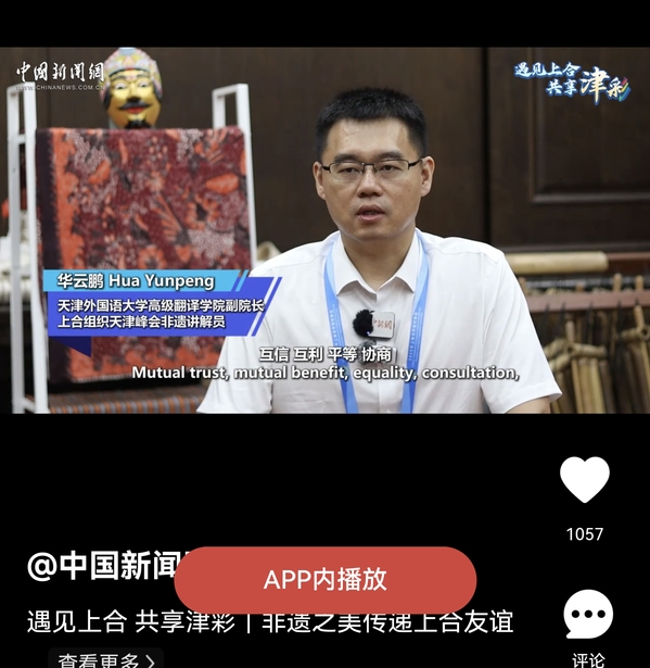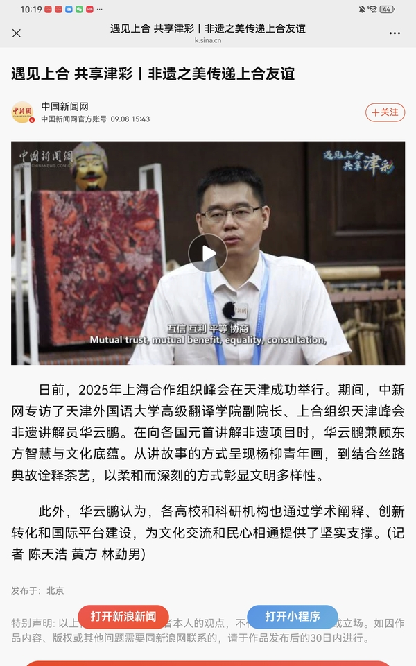 【相约上合】上合峰会期间,中新社专访了我校高级翻译学院副院长、上合组织天津峰会非遗讲解员华云鹏。报道通过中新社全媒体平台发布,并由中央网信办向全网推送。报道指出,在向各国元首讲解非遗项目时,华云鹏兼顾东方智慧与文化底蕴。从讲故事的方式呈现杨柳青年画,到结合丝路典故诠释茶艺,以柔和而深刻的方式彰显文明多样性。他认为,各高校和科研机构也通过学术阐释、创新转化和国际平台建设,为文化交流和民心相通提供了坚实支撑。全文转载如下:日前,2025年上海合作组织峰会在天津成功举行。期间,中新网专访了天津外国语大学高级翻译学院副院长、上合组织天津峰会非遗讲解员华云鹏。在向各国元首讲解非遗项目时,华云鹏兼顾东方智