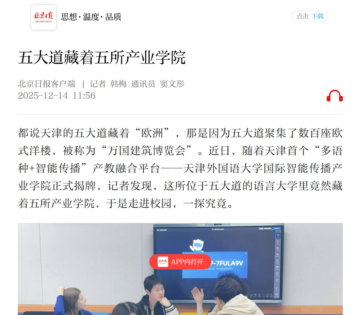 都说天津的五大道藏着“欧洲”,那是因为五大道聚集了数百座欧式洋楼,被称为“万国建筑博览会”。近日,随着天津首个“多语种+智能传播”产教融合平台——天津外国语大学国际智能传播产业学院正式揭牌,记者发现,这所位于五大道的语言大学里竟然藏着五所产业学院,于是走进校园,一探究竟。锐意创新走进天津外国语大学马场道校区,迎面一座欧式洋楼引人注目,楼顶上的古老时钟已嘀嗒走过101年。“眼前的钟楼始建于1924年,是原天津工商学院主楼。现在,我们的师生就在这所全国重点文物保护单位里工作学习。”该校校史讲解员黄娜颖娓娓道来。1964年,在周恩来总理的关怀下,学校应新中国外交事业之需成立,主体前身是秦皇岛外语专科
