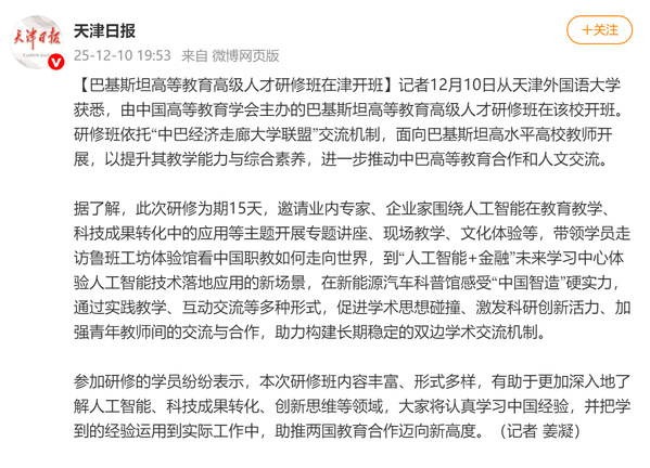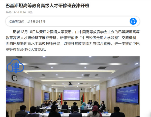 记者12月10日从天津外国语大学获悉,由中国高等教育学会主办的巴基斯坦高等教育高级人才研修班在该校开班。研修班依托“中巴经济走廊大学联盟”交流机制,面向巴基斯坦高水平高校教师开展,以提升其教学能力与综合素养,进一步推动中巴高等教育合作和人文交流。据了解,此次研修为期15天,邀请业内专家、企业家围绕人工智能在教育教学、科技成果转化中的应用等主题开展专题讲座、现场教学、文化体验等,带领学员访鲁班工坊体验馆看中国职教如何走向世界,到“人工智能+金融”未来学习中心体验人工智能技术落地应用的新场景,在新能源汽车科普馆感受“中国智造”硬实力,通过实践教学、互动交流等多种形式,促进学术思想碰撞、激发科研创新