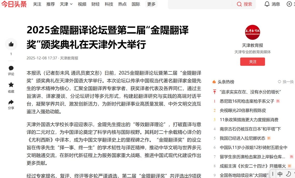 本报讯(记者 姜凝)日前,第九届中央文献翻译与研究论坛在天津外国语大学开幕。本届论坛由中央党史和文献研究院第六研究部、天津外国语大学(中央文献翻译研究基地)联合主办,论坛会聚国内翻译学者和研究专家,共同分享中央文献翻译最新研究成果。“十四五”时期,在中央党史和文献研究院第六研究部的统筹指导下,天津外国语大学中央文献翻译研究基地持续推进政治话语对外翻译、跨语际表述规范、多语种对外传播、早期翻译史考证等中央文献翻译的研究,形成了一批结构多元、路径多样、富有深度的成果,持续推动中央文献外译的学理建构与学术发展。基地聚焦中央文献对外翻译、政治话语阐释、多语种传播与教材建设等任务,出版了一批专著和重要